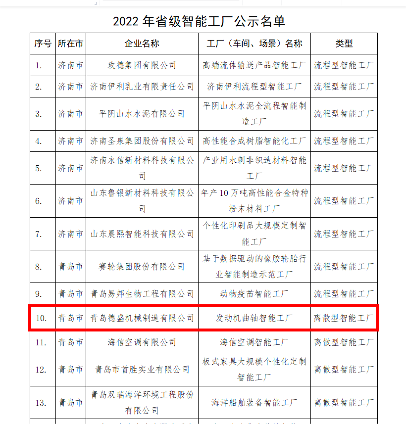 1、近日,山東省工業(yè)和信息化廳公布了2022年山東省級智能工廠(數字化車間場景)名單,我公司成功列入山東省智能工廠。