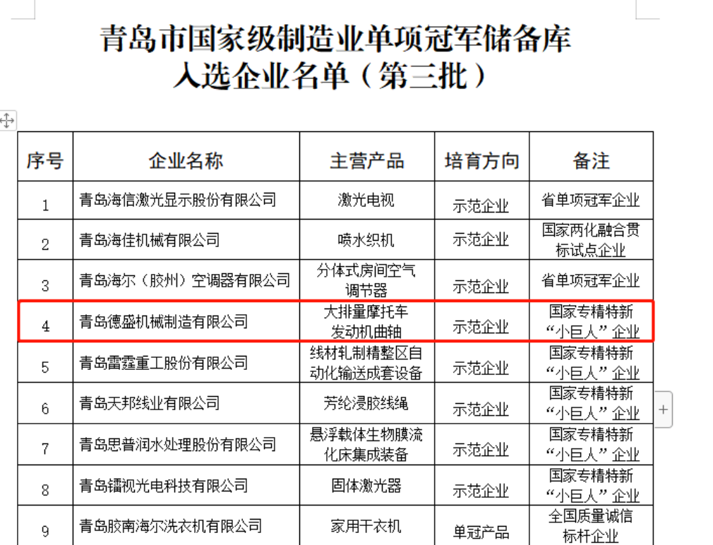 2、近日,青島市工業(yè)和信息化局公布了入選青島市國家級制造業(yè)單項冠軍儲備庫企業(yè)名單(第三批),我公司成功入選。