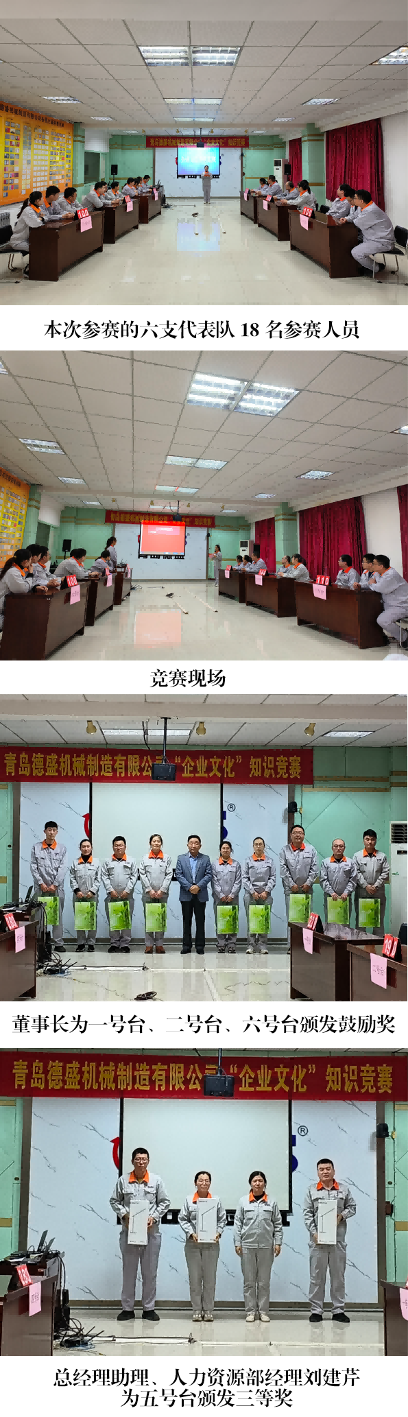 為進(jìn)一步學(xué)習(xí)宣傳公司企業(yè)文化的豐富內(nèi)涵,不斷增強(qiáng)員工弘揚(yáng) 和踐行企業(yè)文化的自覺性,提升企業(yè)“軟實(shí)力”,2023 年 3 月 16 日下午,青島德盛機(jī)械制造有限公司組織開展了企業(yè)文化知識(shí)競(jìng)賽活動(dòng), 公司董事長(zhǎng)孫佩璋,黨委副書記、黨政管理總監(jiān)李建平,黨委委員、董事長(zhǎng)助理、黨政辦公室主任李超,總經(jīng)理助理、人力資源部經(jīng)理劉 建芹出席本次活動(dòng)。